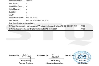 Rubber Products From Fuding pass the certificate of PAHs&CA65 STQ Test